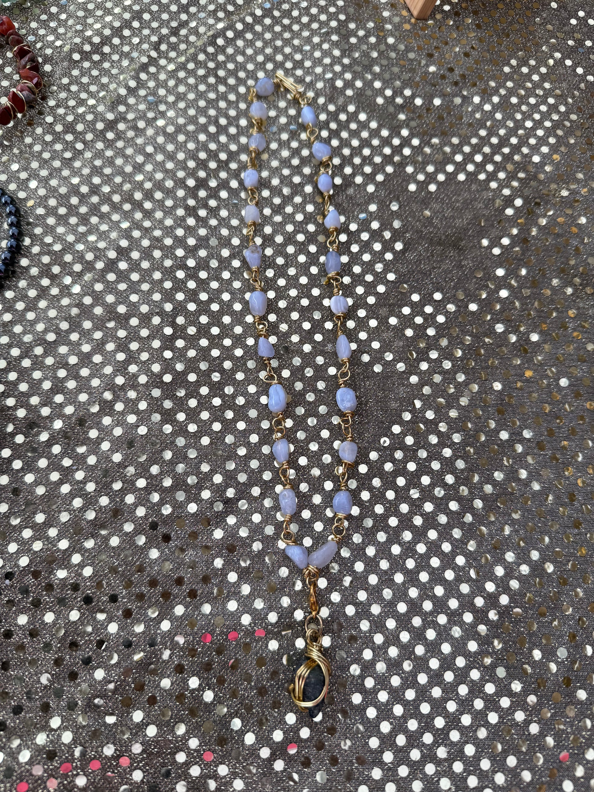This unique necklace features a soothing blue or gray chalcedony paired with raw jasper, wrapped with natural energy and intention. Chalcedony is known for its calming, nurturing vibration—enhancing peaceful communication, emotional balance, and inner reflection. The raw jasper grounds this energy, offering stability, strength, and resilience from the Earth.