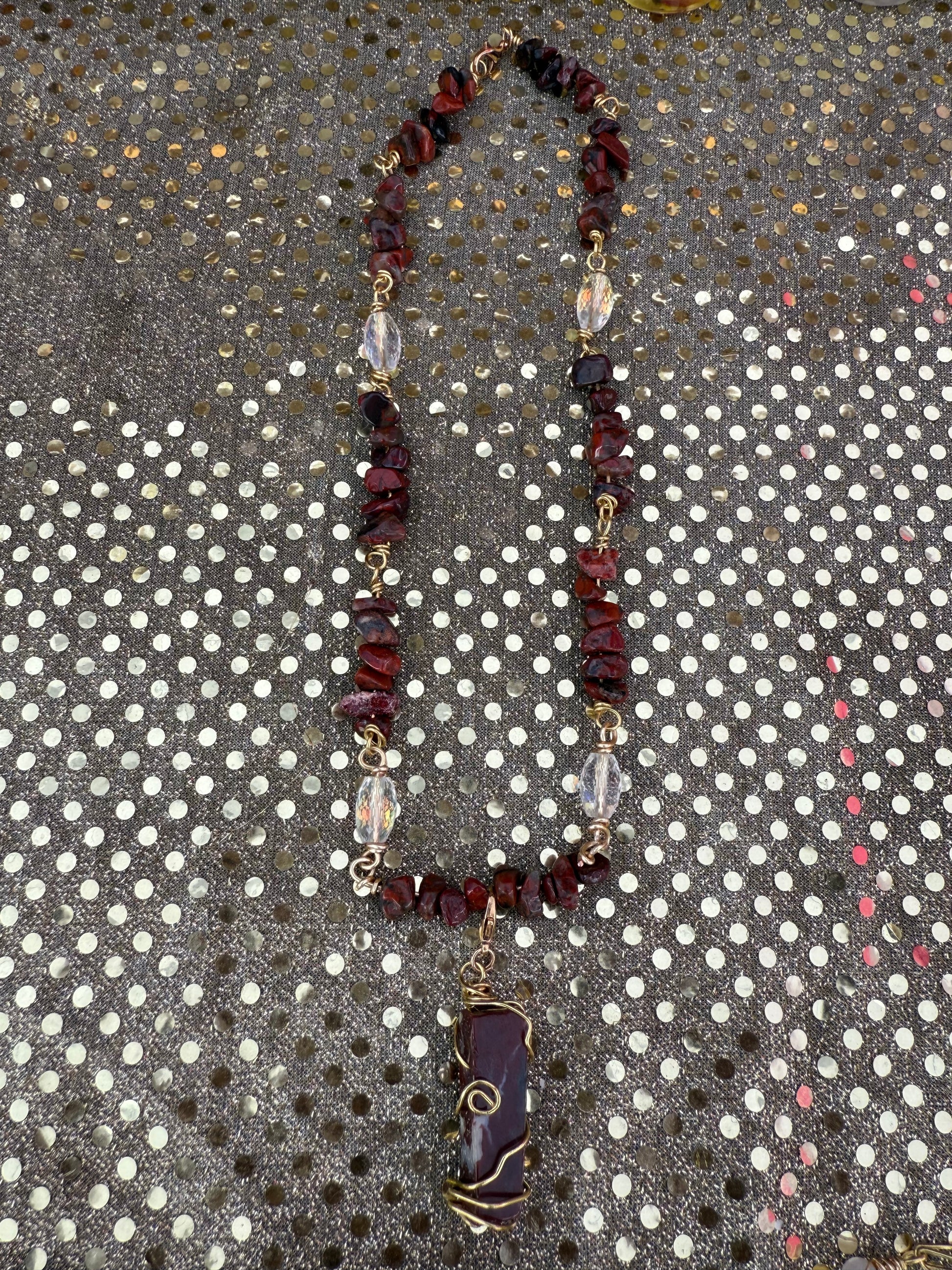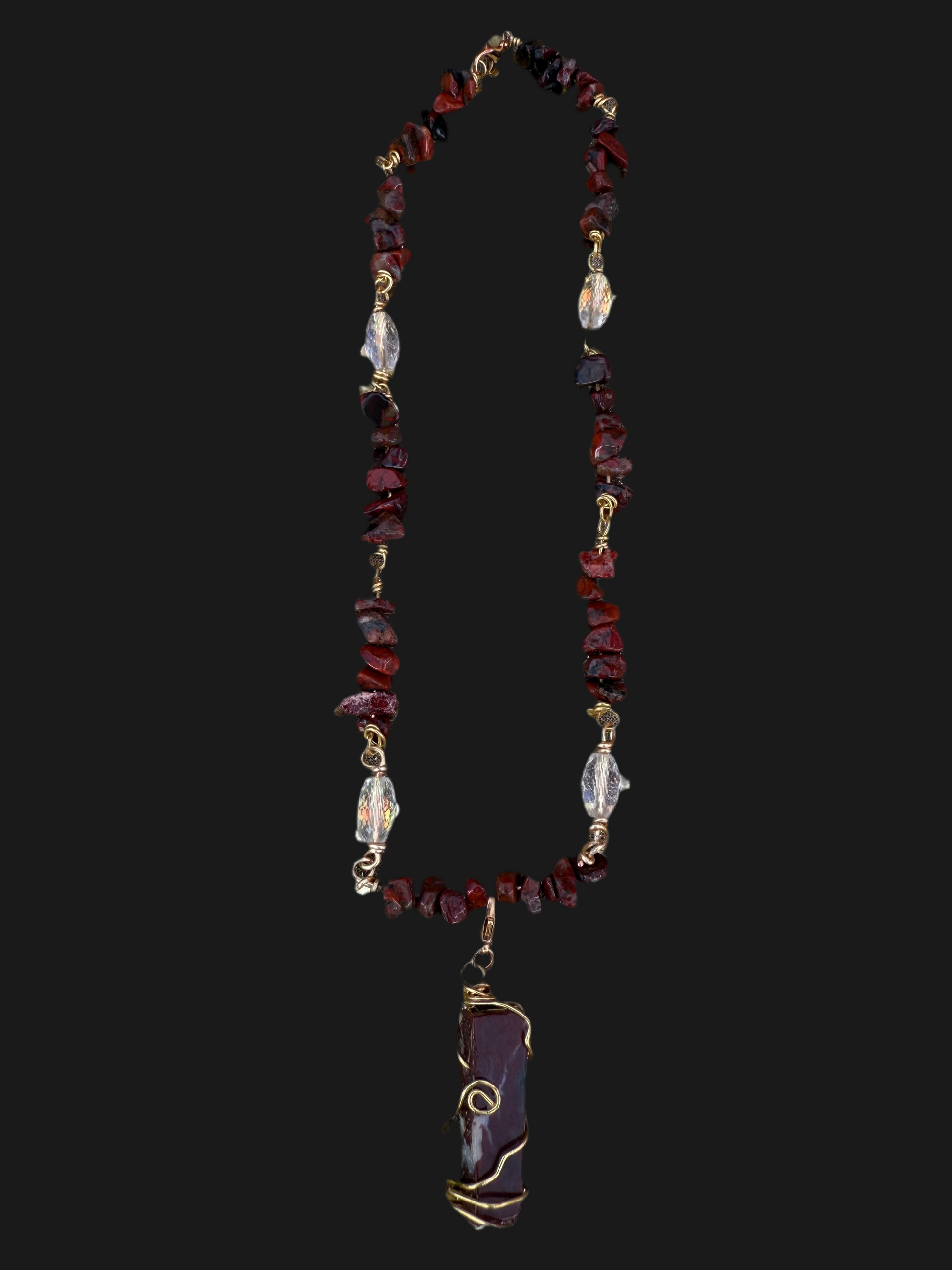 This striking necklace features a rich garnet stone pendant, wrapped in natural copper, radiating strength, sensuality, and spiritual protection. Garnet is the stone of passion, vitality, and grounded desire, while copper enhances and conducts its energy, creating a wearable talisman for bold, heart-led living.